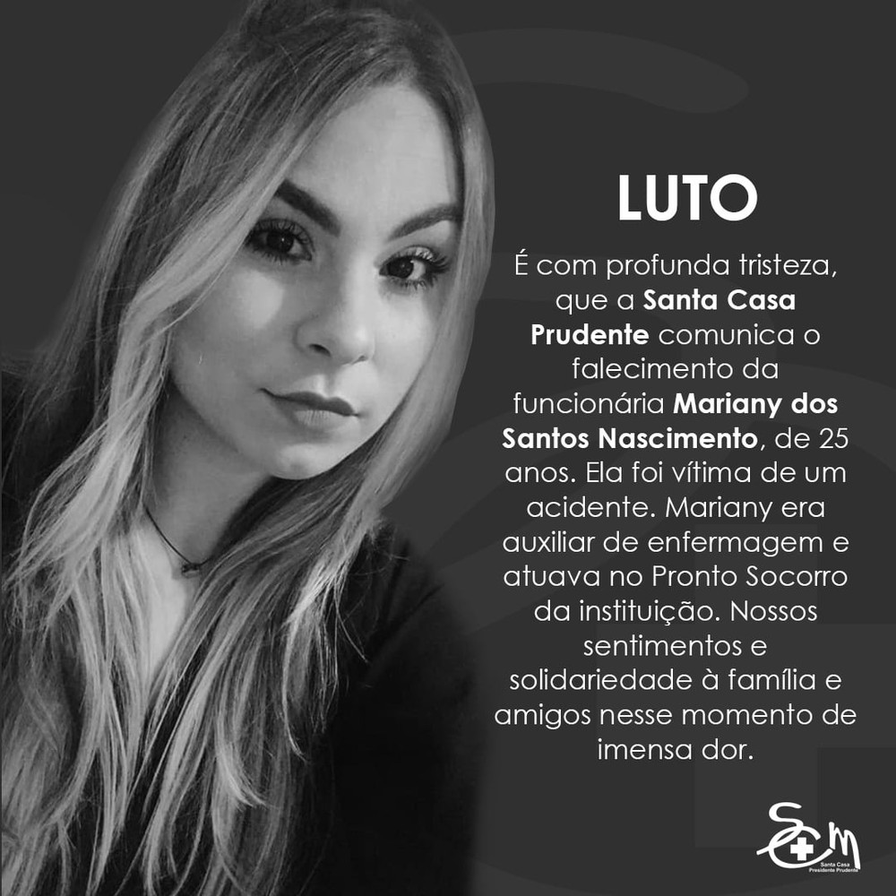 “A Santa Casa de Presidente Prudente comunica, com profunda tristeza, que a vítima do acidente era funcionária da instituição. Ela deu entrada no Pronto-socorro em estado gravíssimo e foi a óbito logo depois. Mariany dos Santos Nascimento, de 25 anos, era auxiliar de enfermagem e atuava no Pronto-socorro. A Santa Casa externa sinceros votos de sentimentos à família e amigos".