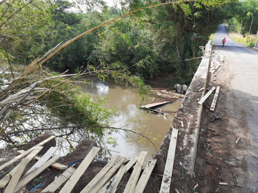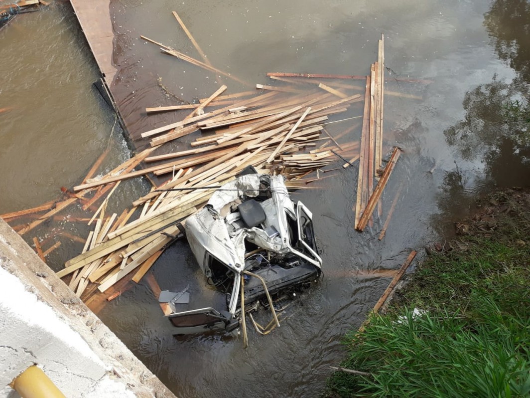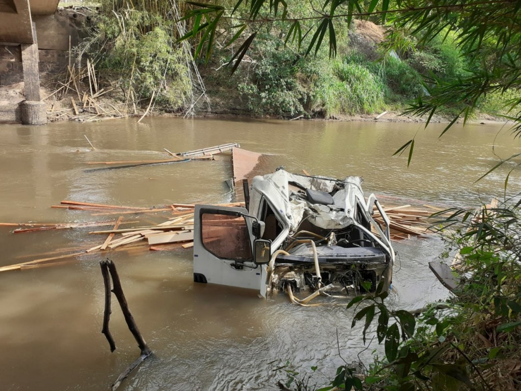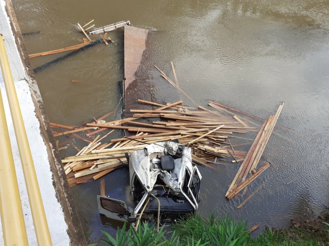 No local, um caminhão carregado com madeira que transitava pela Vicinal, momento em que perdeu o controle da direção e caiu da ponte do Rio do Peixe.