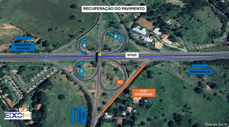 As obras de manutenção do asfalto interditam, nesta quarta-feira (27), a alça localizada no km 445,500 da Rodovia Assis Chateaubriand (SP-425), em Regente Feijó (SP).