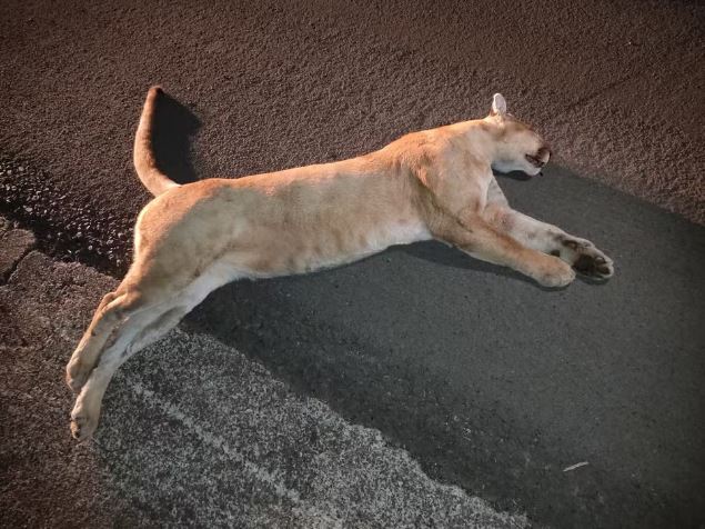 Uma onça-parda (Puma concolor) morreu após ter sido atropelada por uma van escolar, nesta terça-feira (23), no km 532,600 da Rodovia Prefeito Homero Severo Lins (SP-284), em Rancharia (SP).