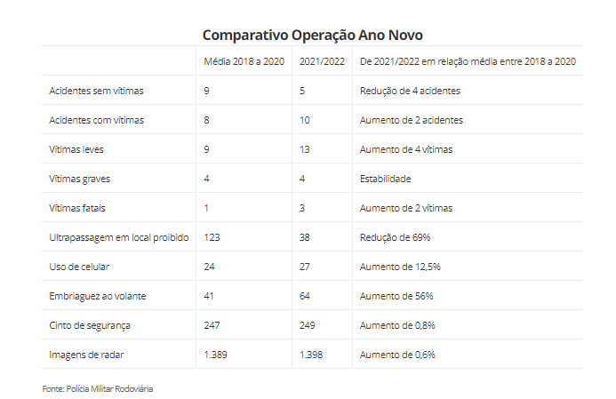 Confira na tabela abaixo o comparativo da Operação Ano Novo nos anos de 2018/2020 e 2021/2022:
