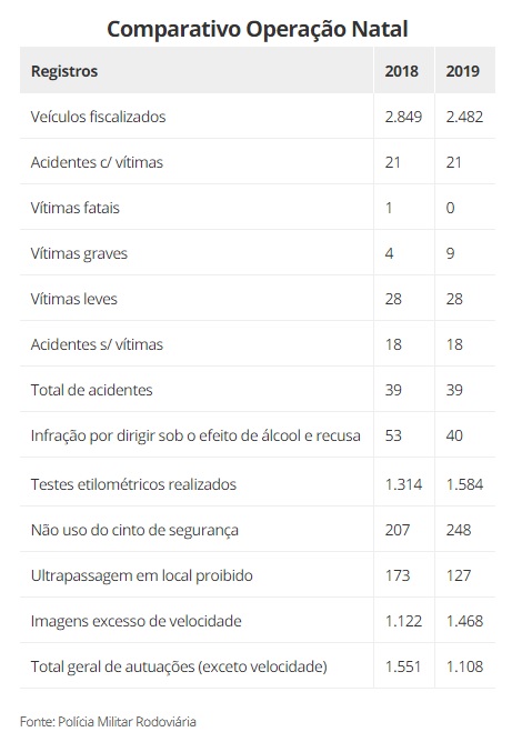 Confira o comparativo da Operação Natal nos anos de 2018 e 2019: