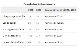 Já em relação às infrações, o número de flagrantes de uso do celular ao volante cresceu mais de 120% de 2021 para 2022. O excesso de velocidade registrou um crescimento de 69% e a falta do cinto de segurança 52,8%.