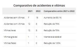 O número de acidentes com vítima teve queda de 75% no comparativo de 2021 e 2022. Já em relação a vítimas graves, o número se manteve estável, com uma vítima, e não houve registros de vítimas fatais na região neste período.