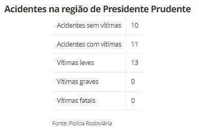 Confira na tabela abaixo o número de acidentes e vítimas registrados.