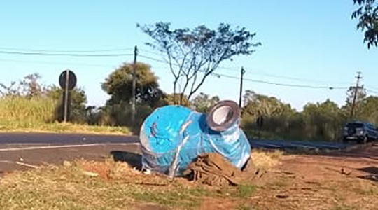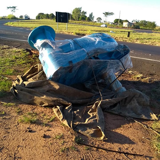 A peça cai pela lateral da carroceria do caminhão, no acostamento, quando o mesmo passava pela rotatória.