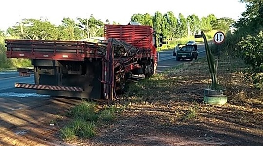 Não houve danos a terceiros nem vítimas. O fechamento lateral da carroceria do caminhão, que é de madeira, sofreu avarias. O recarregamento da peça vai exigir a utilização de apoio por caminhão munk.
