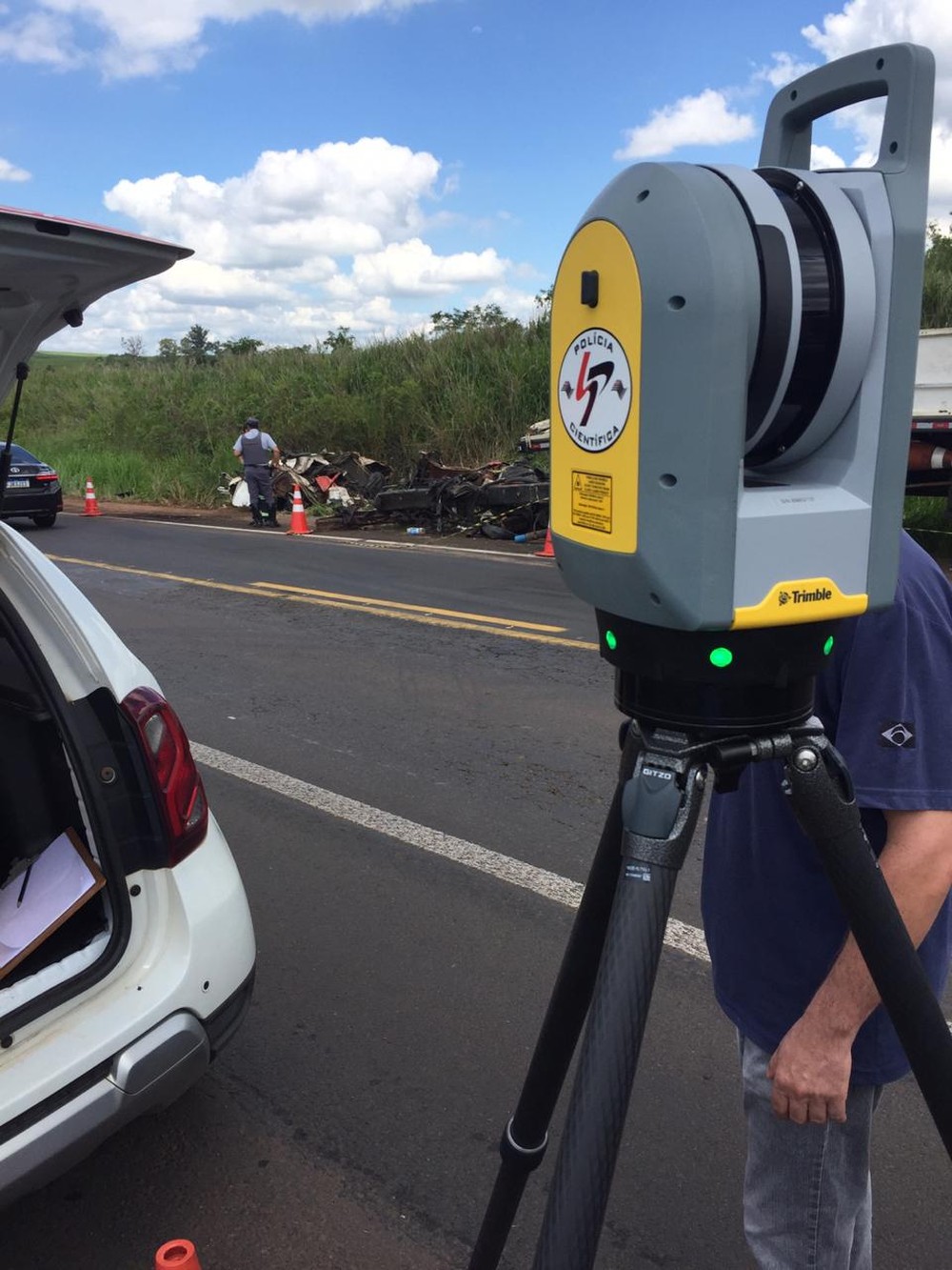 Para a realização do trabalho, o tráfego de veículos foi interrompido nos dois sentidos da rodovia por cerca de meia hora. A equipe utilizou um escâner em 3D. O equipamento foi recém-adquirido pelo Instituto de Criminalística e faz o mapeamento da cena total do acidente.