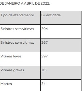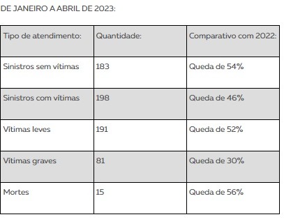 O número de vítimas fatais no primeiro quadrimestre deste ano é 56% menor do que no mesmo período de 2022, quando 34 pessoas morreram em acidentes na região de Presidente Prudente. Por sinal, houve queda em todos os indicadores. Confira nas tabelas abaixo o comparativo entre os períodos de 2022 e 2023: