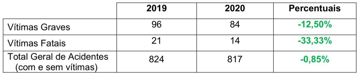 Houve também o registro de 369 vítimas leves decorrentes de acidentes (330 em 2019). Infelizmente, a desatenção, o desrespeito às sinalizações, são fatores que ainda contribuem para essas ocorrências. Em razão disso e com foco na preservação da vida, alcançamos os seguintes resultados: