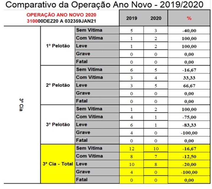 Durante a "Operação Ano Novo 2020 - 2021” não houve registro de nenhuma vítima grave ou fatal nas rodovias dos 54 municípios das regiões de Assis, Marília e Ourinhos, atendidas pela 3ª Companhia do 2º Batalhão de Polícia Rodoviária, sediada em Assis.