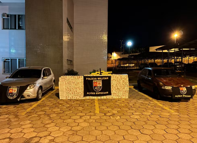 Durante a abordagem, a polícia encontrou dois suspeitos no carro, além de uma caixa com 500 maços de cigarro no porta-malas do veículo e pouco mais de R$ 2 mil em dinheiro.