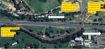 Durante a interdição, os motoristas que precisarem utilizar a passagem superior deverão seguir para os dispositivos mais próximos. No sentido Oeste, o retorno estará disponível no km 563+500. Já no sentido Leste, os motoristas deverão utilizar o retorno no km 557+100.
