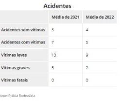 Houve uma queda nos números de acidentes de trânsito com e sem vítimas, com relação ao ano de 2021. Além disso, o quantitativo de vítimas graves também foi reduzido. Veja os dados abaixo: