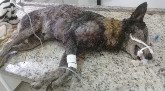 Em estado grave, o cão passou por procedimento em clínica veterinária de Dracena onde a contenção do ferimento exigiu 140 pontos.