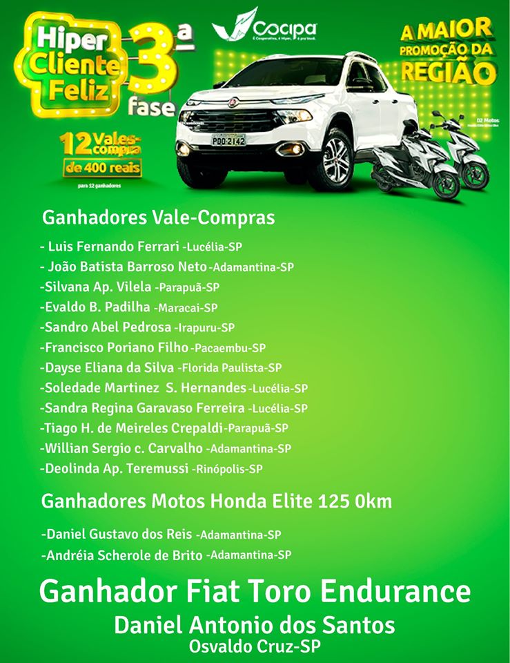 Foi realizado na manhã deste domingo (9) sorteio da terceira e última fase da promoção "Hiper Cliente Feliz", promovida desde 1º de junho pela Cocipa - Cooperativa de Consumo de Inúbia Paulista. Neste domingo foram sorteados 12 vale-compras no valor individual de R$ 400, duas motos Honda Elite 125 zero km e um automóvel Fiat Toro zero km.