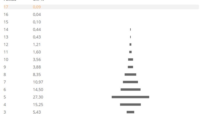 Já as 5 faixas da base da pirâmide, com renda mensal de até 5 salários mínimo, reuniram 15,9 milhões de brasileiros, ou 54,8% do total de contribuintes, que receberam, juntos, um valor inferior: 17,3% do total de rendimentos declarados.