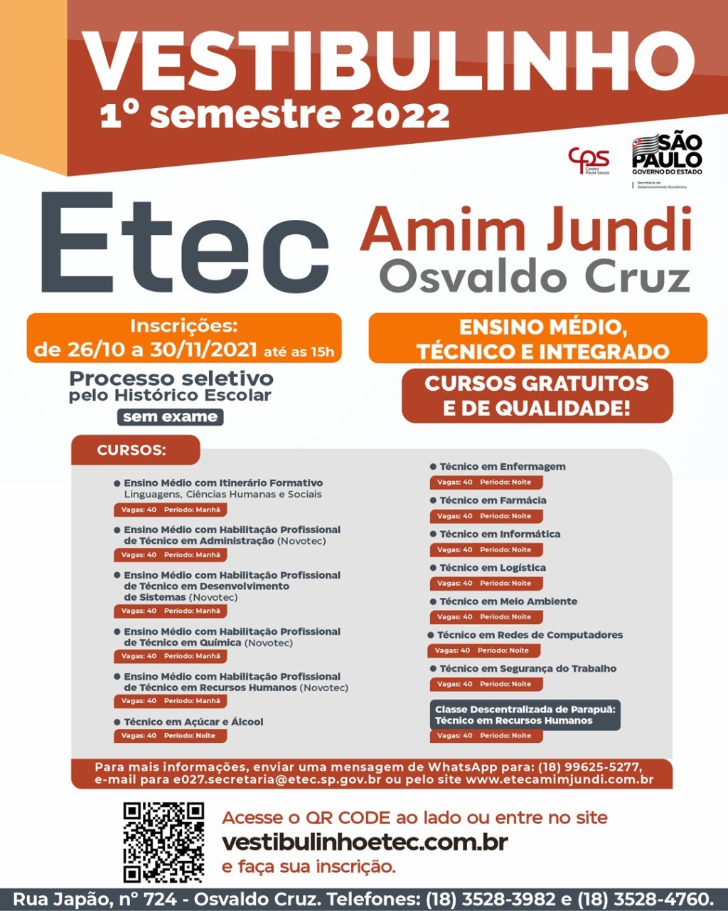A Etec Amim Jundi, de Osvaldo Cruz, está com inscrições abertas para o Processo Seletivo Vestibulinho do 1º semestre de 2022. O ingresso se dará pela análise do histórico escolar.