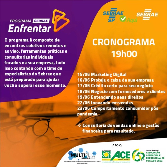 A Secretaria Municipal de Indústria e Comércio, a Associação Comercial e Empresarial de Osvaldo Cruz, o Sebrae-SP e o Banco do Povo Paulista alertam para curso do Programa Enfrentar do Sebrae para que microeempreendedores individuais possam ter acesso à linha de crédito para enfrentamento da crise econômica trazida pela pandemia da Covid-19.