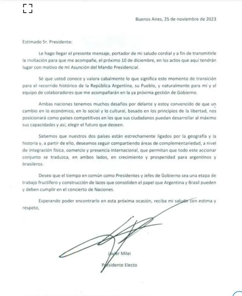 “Estimado presidente, te faço chegar a presente mensagem, portador de meus cordiais cumprimentos, para transmitir o convite que me acompanhe, no próximo dia 10 de dezembro, nos atos que aqui terão lugar por motivo de minha ascensão ao mandato presidencial”, diz o documento.