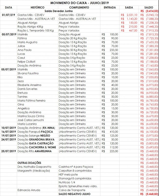 Segundo a voluntária Fátima Canuto, a ong se comprometeu a realizar prestação de contas todos os meses. “Conforme nos comprometemos, segue a nossa prestação de Contas do Mês de Julho. Nela vocês poderão verificar tudo o que foi arrecadado em doações em dinheiro, em ração e outras doações, e, ainda verificar o nosso saldo devedor.”, disse.
