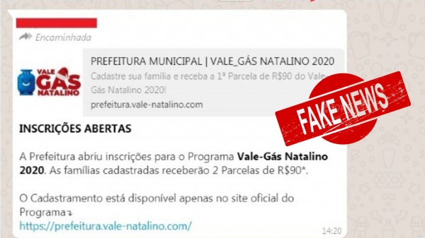 Em nota à imprensa divulgada na tarde desta quarta-feira (18), a Prefeitura de Adamantina, por meio da Secretaria de Assistência Social, informa que a mensagem que está circulando pelas redes sociais informando que estão abertas inscrições para o Programa Vale-Gás Natalino é fake news. “Neste momento, nenhum cadastramento está sendo realizado com o objetivo de doar duas parcelas de R$ 90,00 destinadas a compra de gás”, avisa o comunicado.