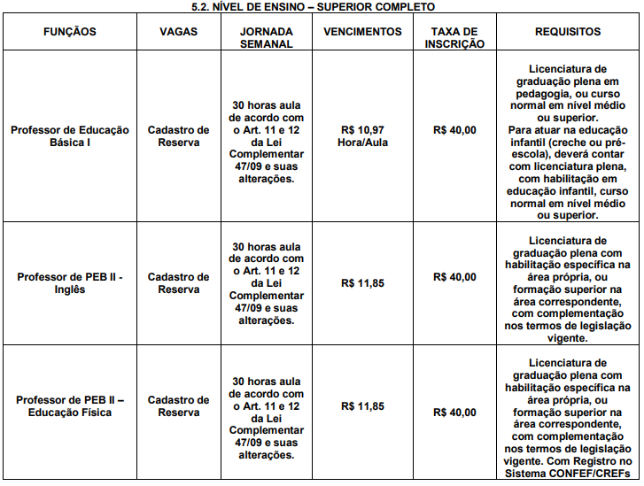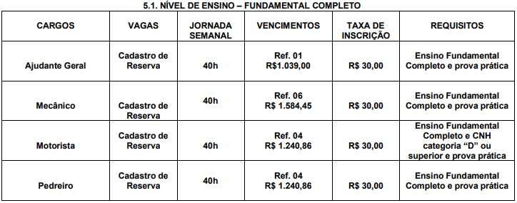 A taxa de inscrição para o concurso ou processo de seleção varia conforme o nível de escolaridade. Custa R$ 30 para os cargos que exigem o ensino fundamental completo, R$ 35 para cargos que exigem ensino médio e R$ 40 para cargos em nível superior. As inscrições são recebidas exclusivamente no site. Após a publicidade, veja o detalhamento das vagas oferecidas.