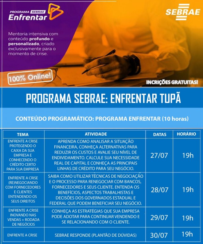 O Sebrae Aqui de Tupã informa que serão encontros ao vivo, coletivos, à distância, com atendimento individualizado, e ferramentas práticas focadas nas pequenas empresas. O curso foi pautado em cinco frentes de ação: Proteção de caixa; Soluções de Crédito; Renegociação; Vendas Online; e Medidas Governamentais.