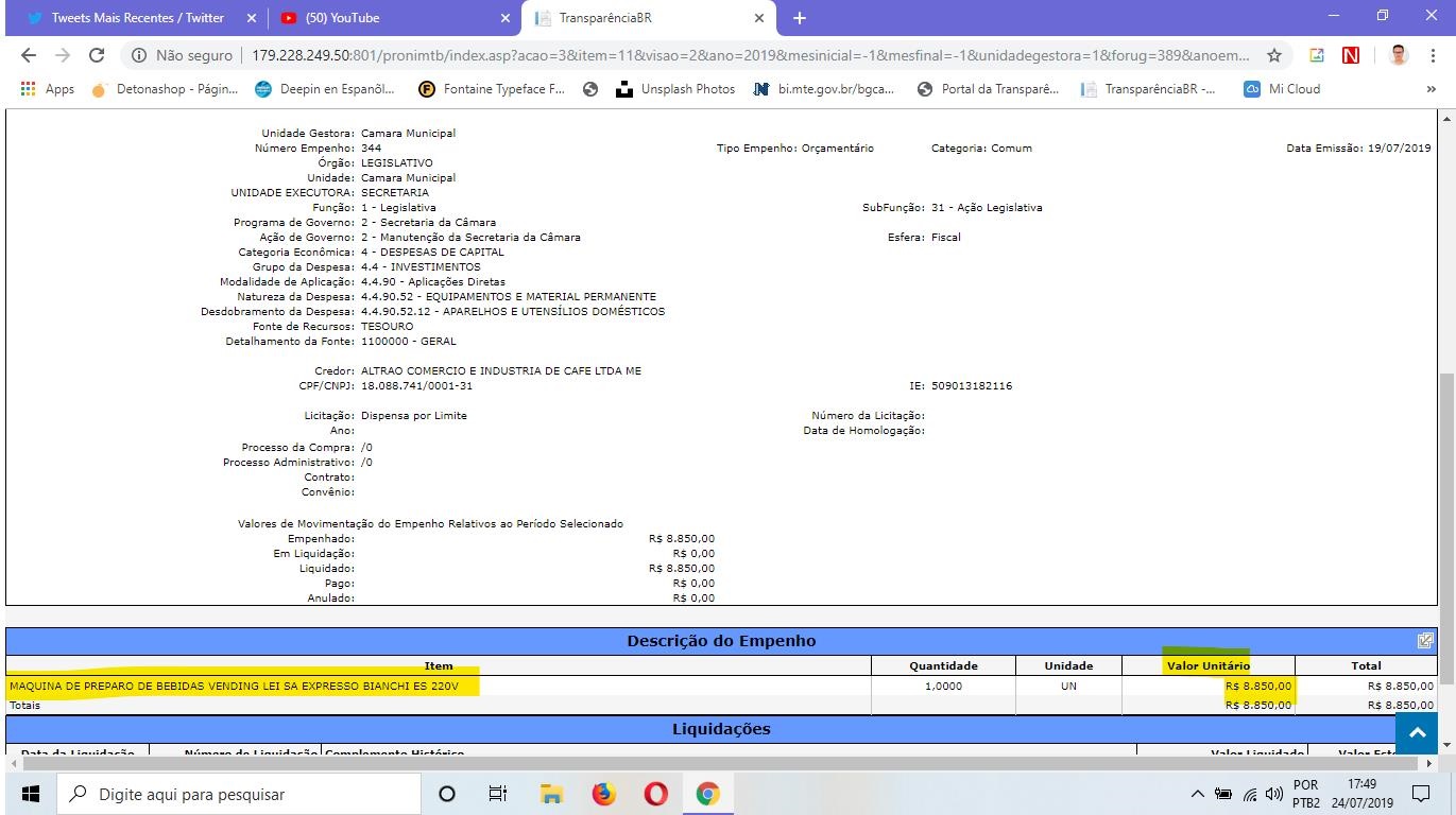No final da tarde desta quarta-feira (24), um internauta morador em Osvaldo Cruz, postou em sua página na rede social Facebook, uma foto do Portal da Transparência que revela um gasto de quase R$9 mil pela Câmara Municipal de Osvaldo Cruz com a compra de uma máquina de café.