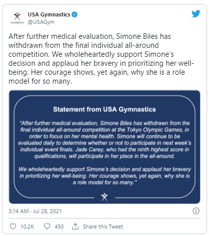"Após avaliação médica adicional, Simone Biles retirou-se da competição individual geral final. Apoiamos de todo o coração a decisão de Simone e aplaudimos sua bravura em priorizar seu bem-estar. Sua coragem mostra, mais uma vez, por que ela é um modelo para tantos"