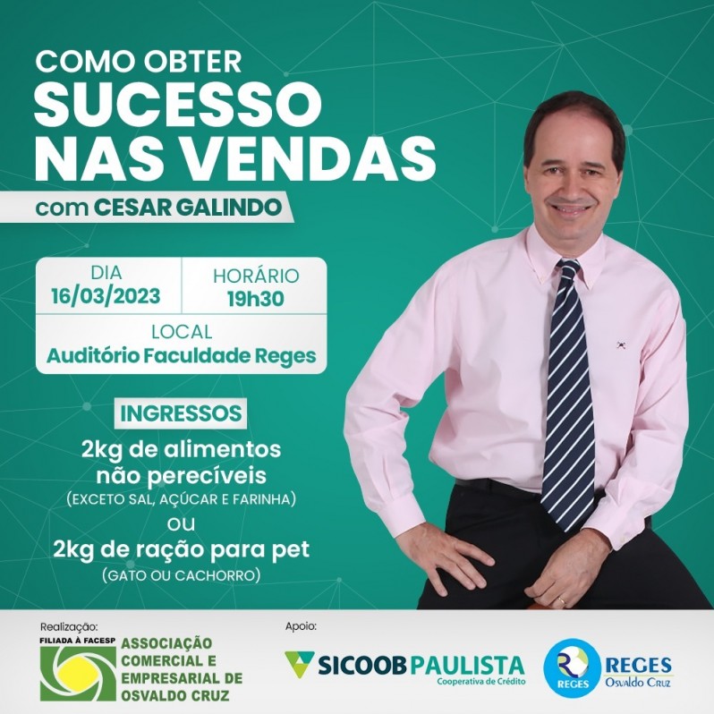 A ACEOC (Associação Comercial e Empresarial de Osvaldo Cruz), com o apoio do SICOOB Paulista e da Faculdade Reges, vai realizar no próximo dia 16 de março, a palestra "Como obter sucesso nas vendas", com Cesar Galindo.