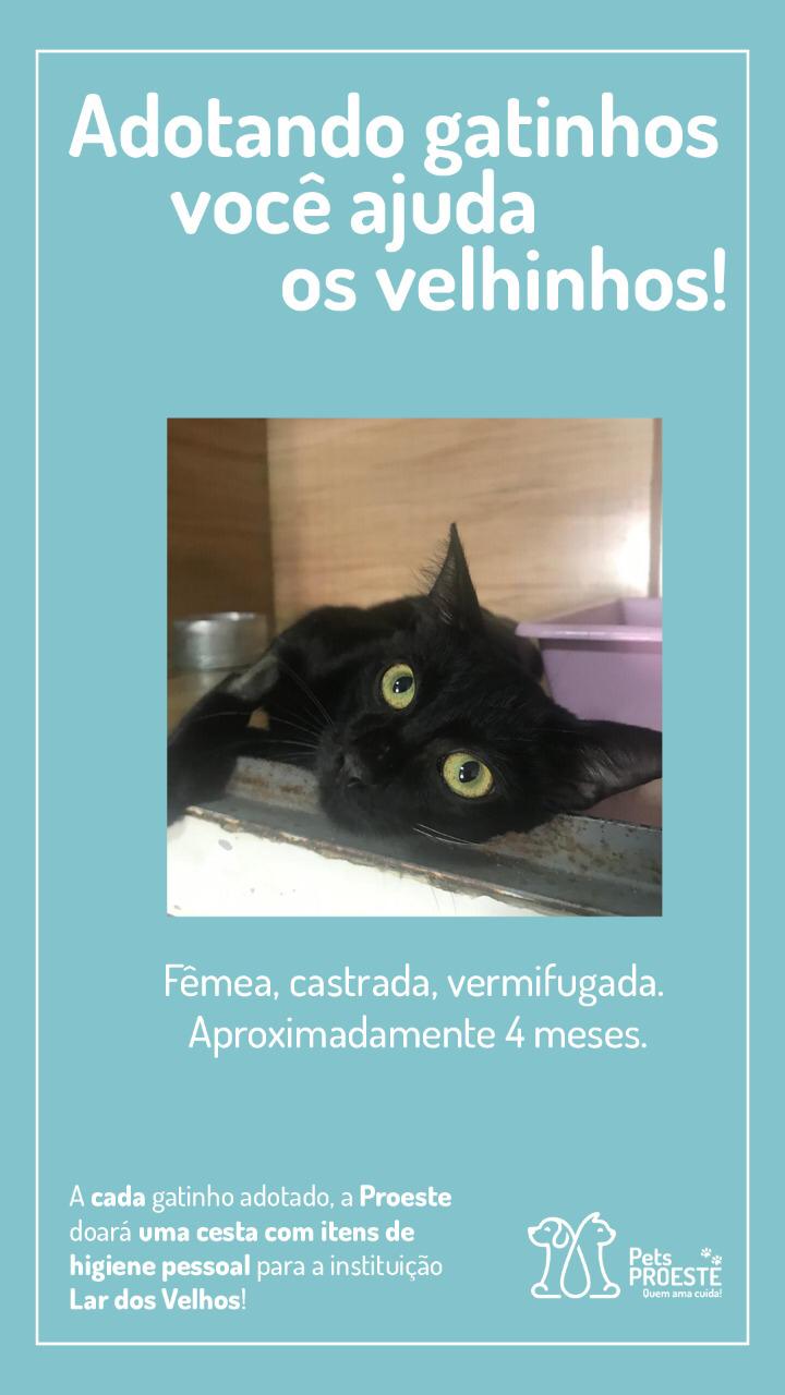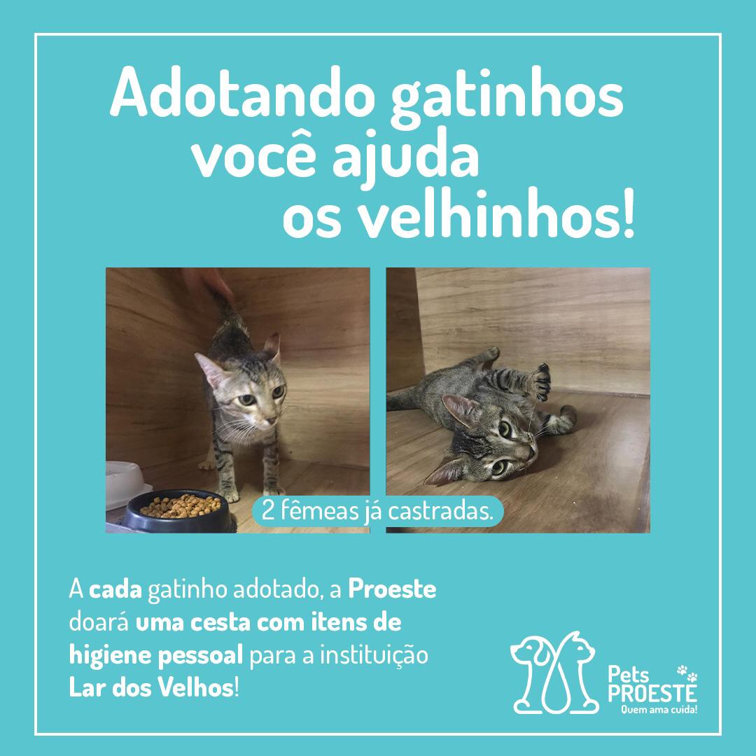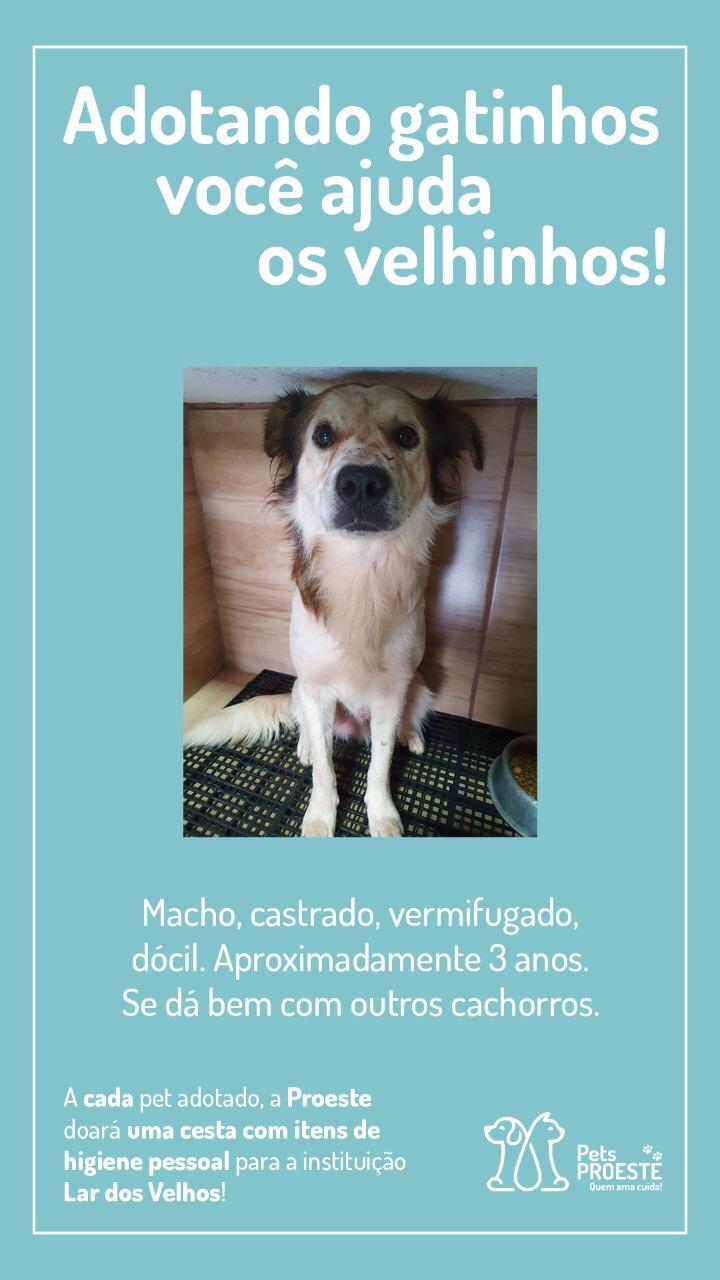 Já esses quatro amiguinhos também estão disponíveis para adoção, só que na cidade de Adamantina. A Proeste fará uma doação de cestas de produtos de higiene pessoal para o Lar dos Velhos da cidade a cada pet adotado! Olha só que corrente do bem, você adota um animal abandonado e ainda ajuda o Lar dos Velhos de Adamantina.