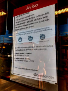 “Caros clientes: esta agência encontra-se temporariamente fechada como medida preventiva para garantir seu bem-estar, de nossos colaboradores e da sociedade. Retornaremos em breve”.