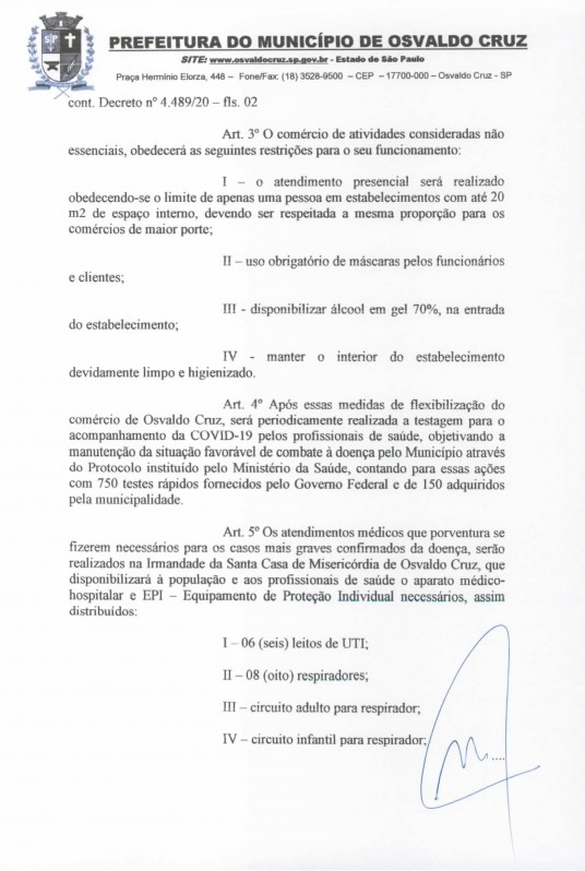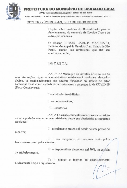 Atendendo uma solicitação feita pela Aceoc (Associação Comercial e Empresarial de Osvaldo Cruz), a Prefeitura autorizou a retomada dos atendimentos presenciais dos estabelecimentos considerados não essenciais, desde esta segunda-feira (13). Pelo decreto do governador de São Paulo, a flexibilização ocorreria a partir do dia 15 de julho.