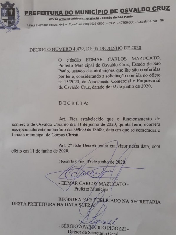 Depois de nova solicitação da Aceoc (Associação Comercial e Empresarial de Osvaldo Cruz), juntamente com o Sincomércio (Sindicato do Comércio Varejista), em comum acordo com o Sincomerciário (Sindicato dos Empregados no Comércio), a Prefeitura de Osvaldo Cruz determinou o funcionamento do comércio não essencial nesta quinta-feira, dia 11 de junho, Dia de Corpus Christi.