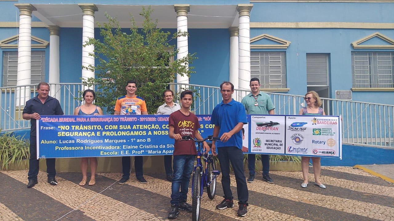 A Prefeitura de Osvaldo Cruz, através do Departamento de Trânsito e da Secretaria de Educação, realizou nesta segunda-feira (09) a entrega de bicicletas aos alunos vencedores do Concurso de Frases alusivas ao trânsito.