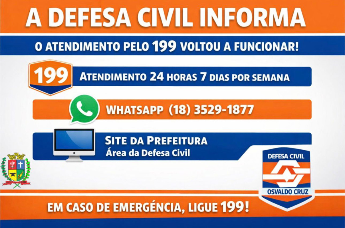 A Defesa Civil de Osvaldo Cruz informa à população que o atendimento pelo telefone 199 já está funcionando normalmente.
