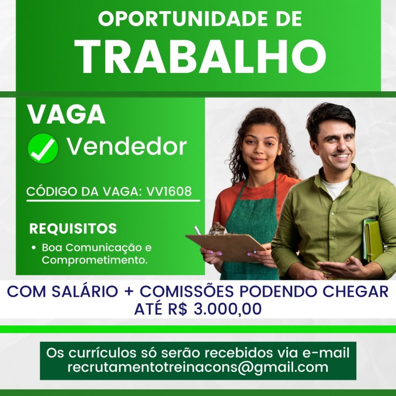 A vaga é para Vendedor e os requisitos são ter boa comunicação e comprometimento, sendo que a pessoa vai ter salário fixo e a oportunidade de ganho de comissões que podem chegar até R$3 mil.