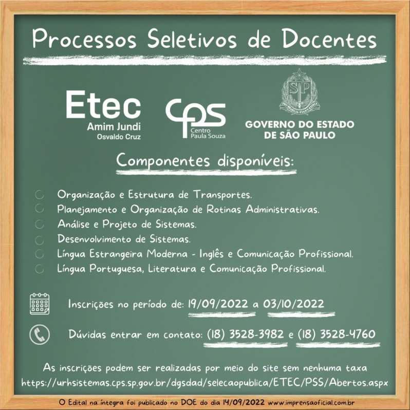 O Edital na íntegra foi publicado no DOE (www.imprensaoficial.com.br) do dia 15/09/2022.