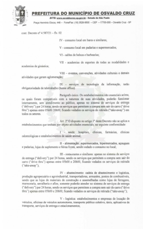 Assim, o Município de Osvaldo Cruz alinhou seus protocolos sanitários e o distanciamento social e determinou de acordo com orientação do Governo do Estado que os estabelecimentos não essenciais não poderão funcionar e estão suspensas as seguintes atividades;