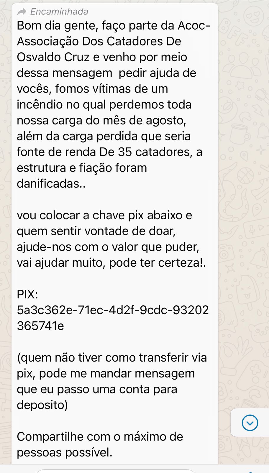 Em uma mensagem, que circula pelo WhatsApp, pede dinheiro através de transferências eletrônicas via Pix, alegando que a entidade passa por dificuldades financeiras após ter sido vítima de incêndio recente.