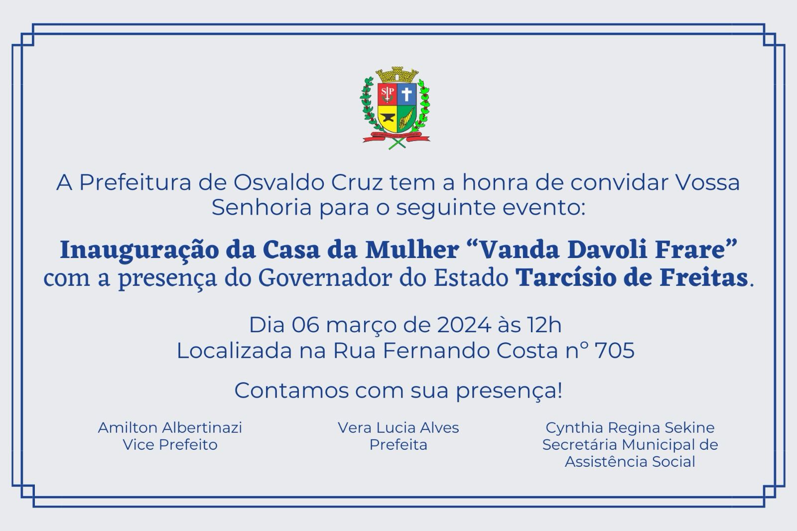 Nesta quarta-feira (6) Osvaldo Cruz recebe o Governador Tarcísio de Freitas para a inauguração da Casa da Mulher “Vanda Davoli Frare”. O evento está marcado para às 12 horas na Rua Fernando Costa, 705, no centro, próximo da antiga Fepasa.