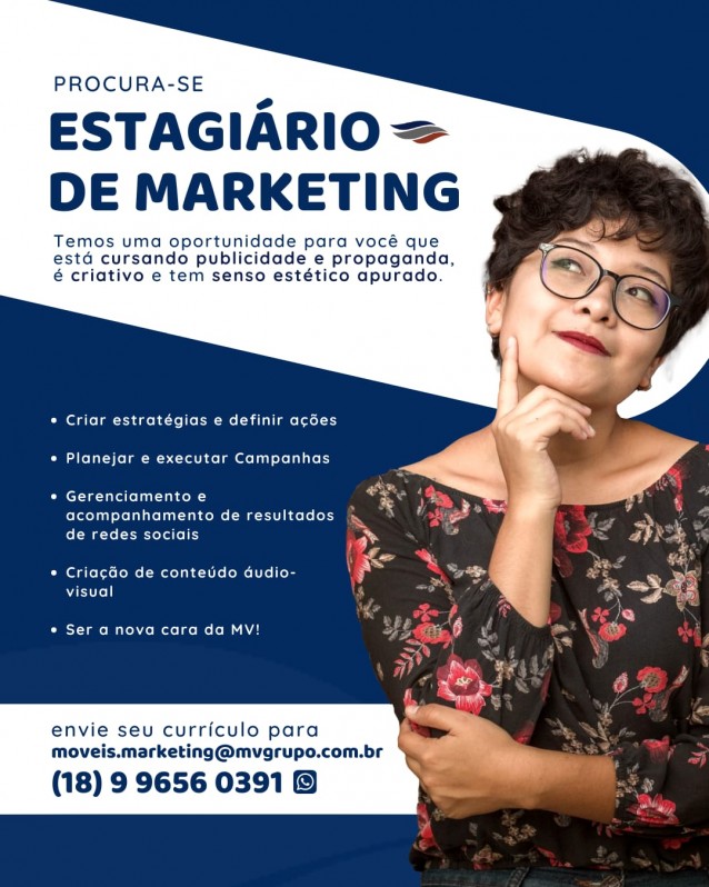 O Grupo MV está com uma vaga disponível para estagiário na área de Marketing. Os requisitos são ser criativo, ligado nas tendências e que amar se comunicar, além de estar cursando ensino superior em Comunicação Social, Publicidade e Propaganda ou Marketing e possuir conhecimento em programas de edição.