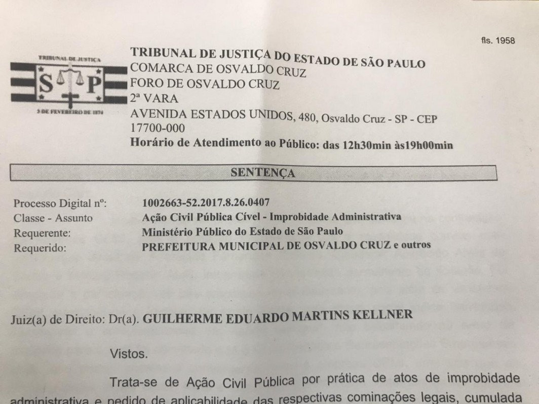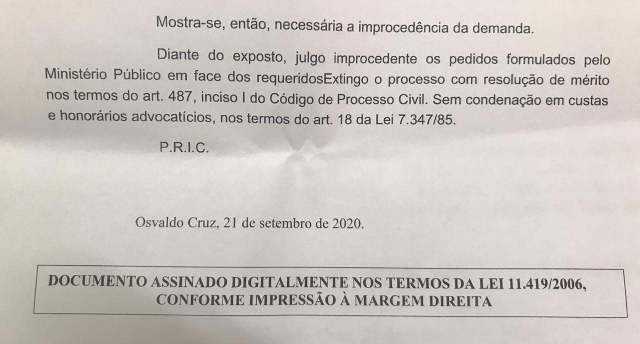 Em sentença, o Juiz da 2a Vara da Comarca de Osvaldo Cruz, Guilherme Martins Kellner, entendeu que não não ficou comprovado o ato de improbidade administrativa e nem intenção por parte dos envolvidos em lesar os cofres públicos. Também não restou provado prejuízo à Prefeitura. Desta forma a ação foi julgada improcedente.