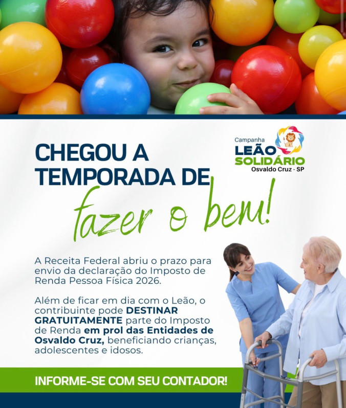 A campanha Leão Solidário, uma iniciativa promovida pelo Lions Clube, incentiva moradores e empresas a destinarem parte do Imposto de Renda devido para fundos municipais.