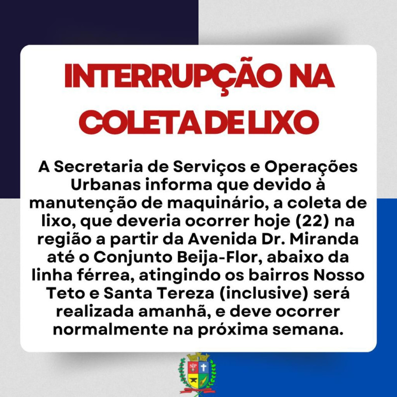 A Secretaria de Serviços e Operações Urbanas informa que devido à manutenção de maquinário, a coleta de lixo, que deveria ocorrer nesta quarta-feira (22) na região a partir da Avenida Dr. Miranda até o Conjunto Beija-Flor, abaixo da linha férrea, será realizada na quinta-feira (23).