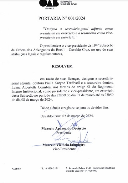 No mesmo documento foram designadas a Secretária Geral, Paula Tardivelli e a Tesoureira, Luana Coimbra, para ocuparem temporariamente a presidência e a vice-presidência da subsecção.