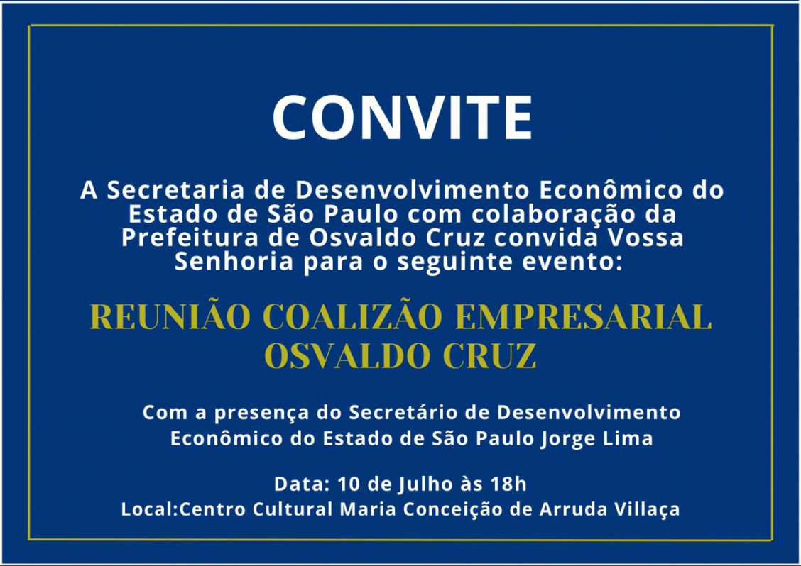 O Governo do Estado de São Paulo, através da Secretaria de Desenvolvimento em parceria com a Secretaria de Desenvolvimento da Prefeitura de Osvaldo Cruz realizam hoje (10) a Reunião "Coalizão Empresarial Osvaldo Cruz".