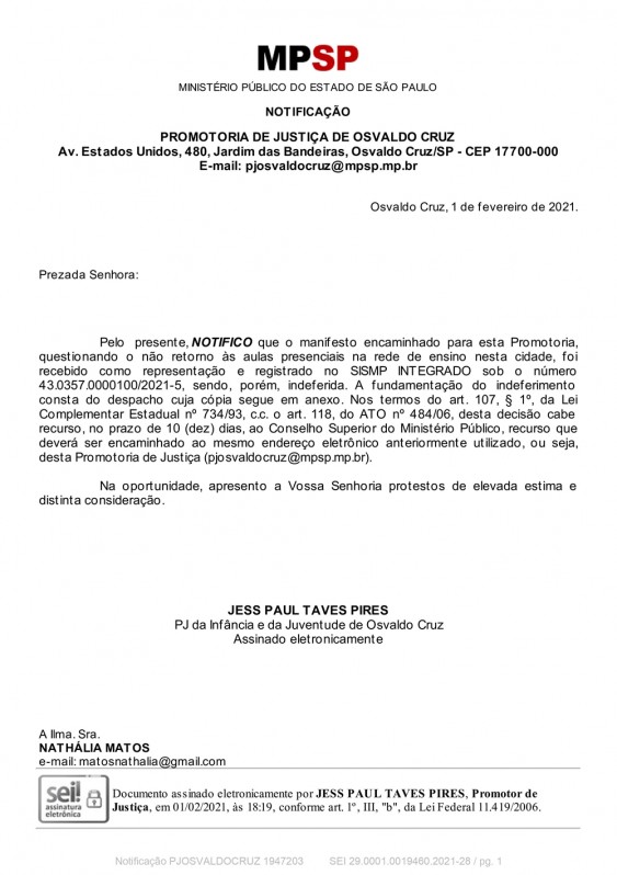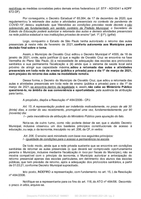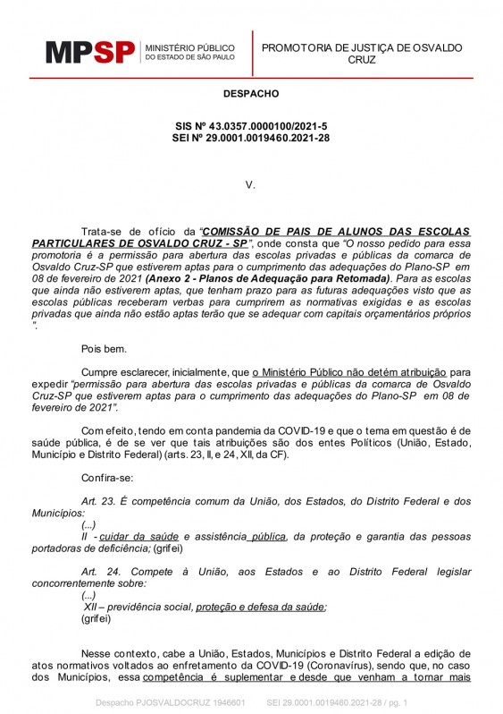 As mães destacaram ainda, que já procuraram o Ministério Público no início do ano pedindo a volta às aulas de maneira presencial e receberam resposta de que não cabe ao MP essa decisão. “O Decreto do Município de Osvaldo Cruz, que adiou a retomada das aulas e atividades presenciais em toda rede de ensino (pública e privada) para o dia 1º de março de 2021, se encontra dentro da legalidade e, assim, não cabe ao Ministério Público questioná-lo, no âmbito de sua conveniência e oportunidade, pela ausência de atribuição para tanto.”, diz o documento.