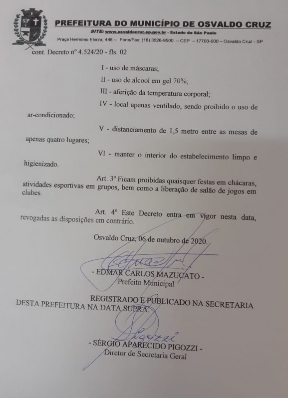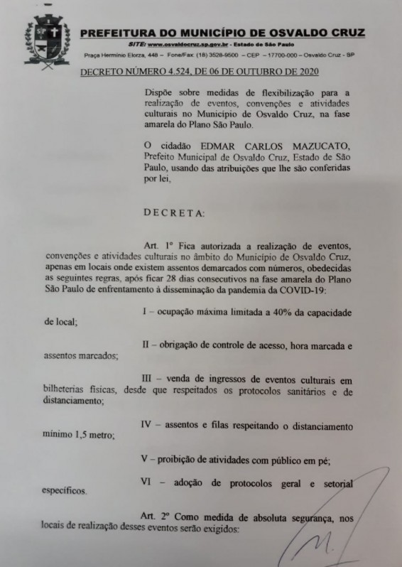 Nesta semana, a Prefeitura de Osvaldo Cruz fez alteração no decreto que trata sobre a realização de eventos no município devido à pandemia da Covid-19.